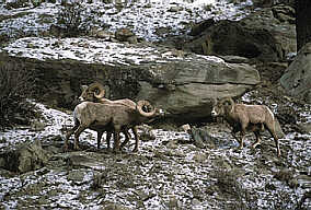 These are Bighorn Sheep. The Rocky Mountain Bighorn lives mainly on the western slopes of the Rocky Mountains. From the Crowsnest pass North to just South of Golden. It is slightly larger then the California Bighorn. The California Bighorn can be seen on some eastern slopes of the Cascade, the Fraser canyon and the canyon of the Chilcotin River.