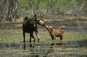 Moose with a calf. The Moose is a forest animal and lives on deciduous trees